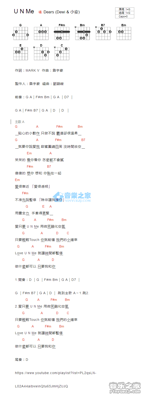 吉他Dears《U N Me》吉他谱_吉他弹唱谱_YYZJ编配