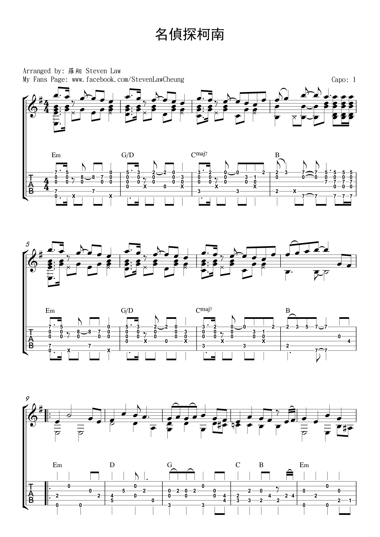 名侦探柯南吉他谱指弹版,一首旋律非常好听的曲子,名侦探柯南吉他独奏谱,喜欢这首曲子的朋友们可以参照练习。...