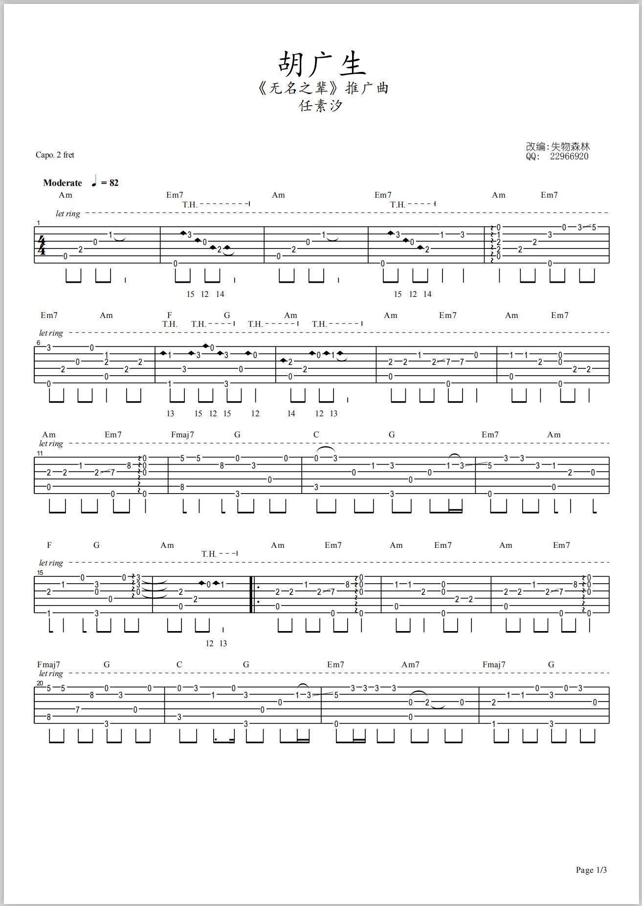 吉他胡广生指弹谱 附演示_失物森林编配_任素汐