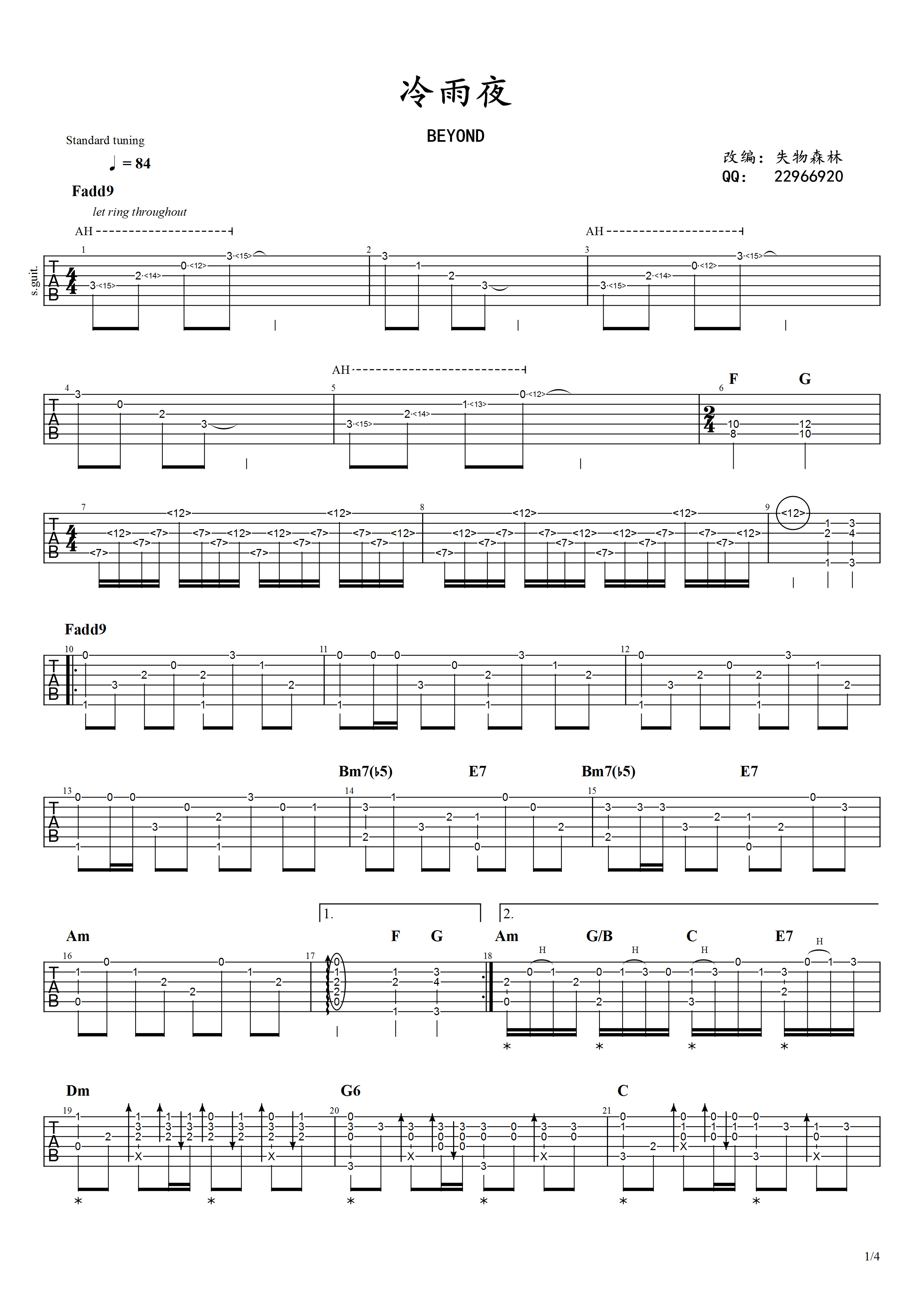 《冷雨夜》吉他谱G调扫弦版独奏_失物森林编配_BEYOND...
