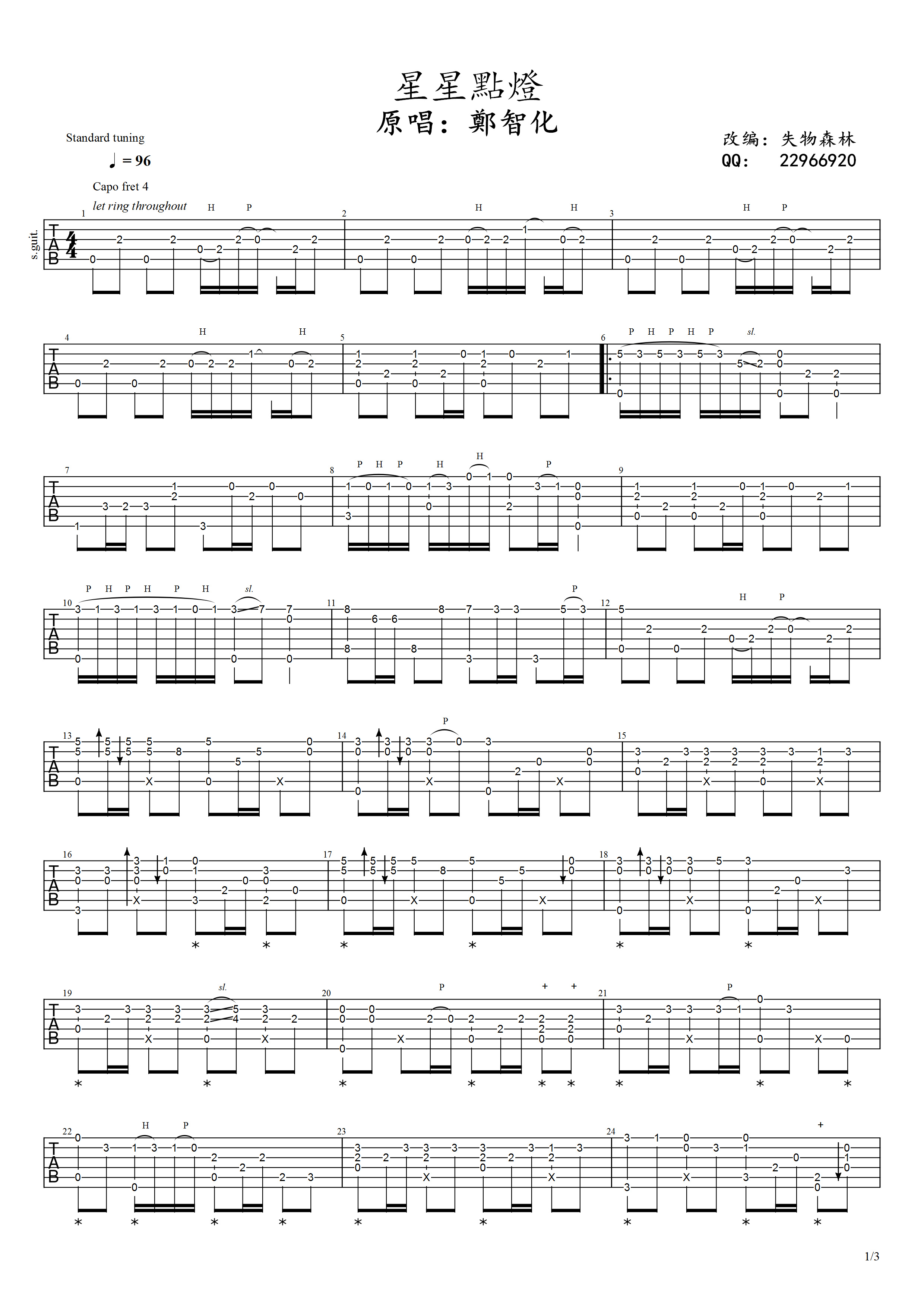 吉他《星星点灯》吉他谱 G调六线谱独奏_失物森林编配_郑智化