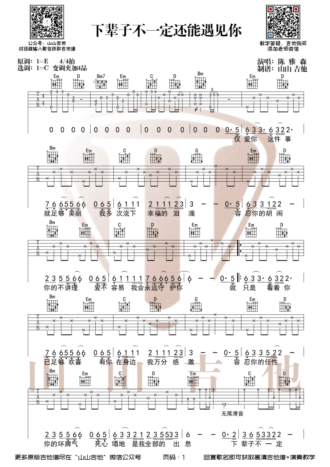 《下辈子不一定还能遇见你》吉他谱_陈雅森_C调弹唱六线谱...