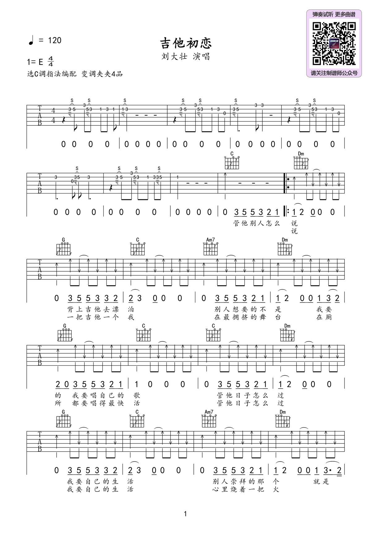 《吉他初恋》吉他谱_刘大壮_C调弹唱六线谱_高清图片谱分享...