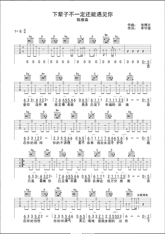 吉他陈雅森《下辈子不一定还能遇见你》吉他谱_G调吉他弹唱谱