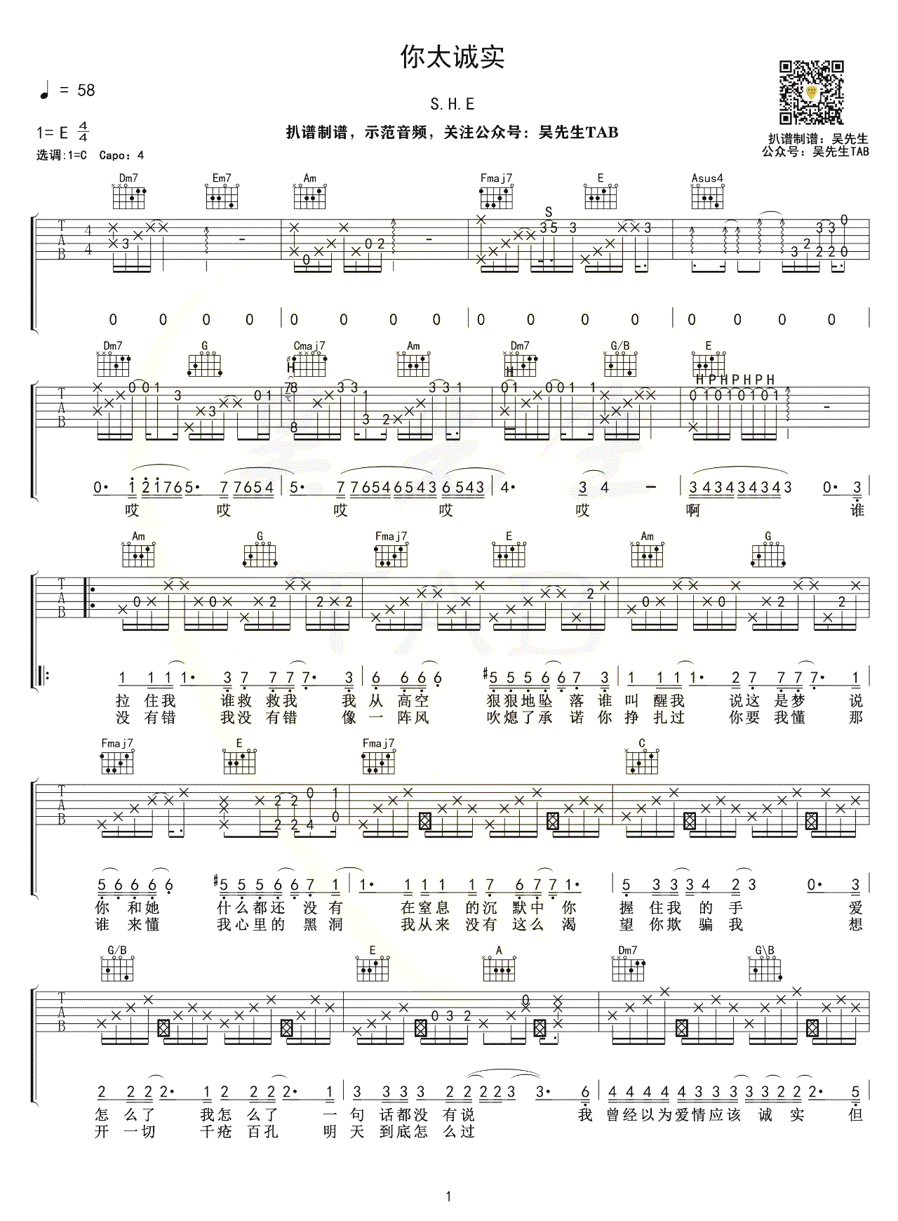 你太诚实吉他谱_SHE_C调指法_弹唱六线谱...