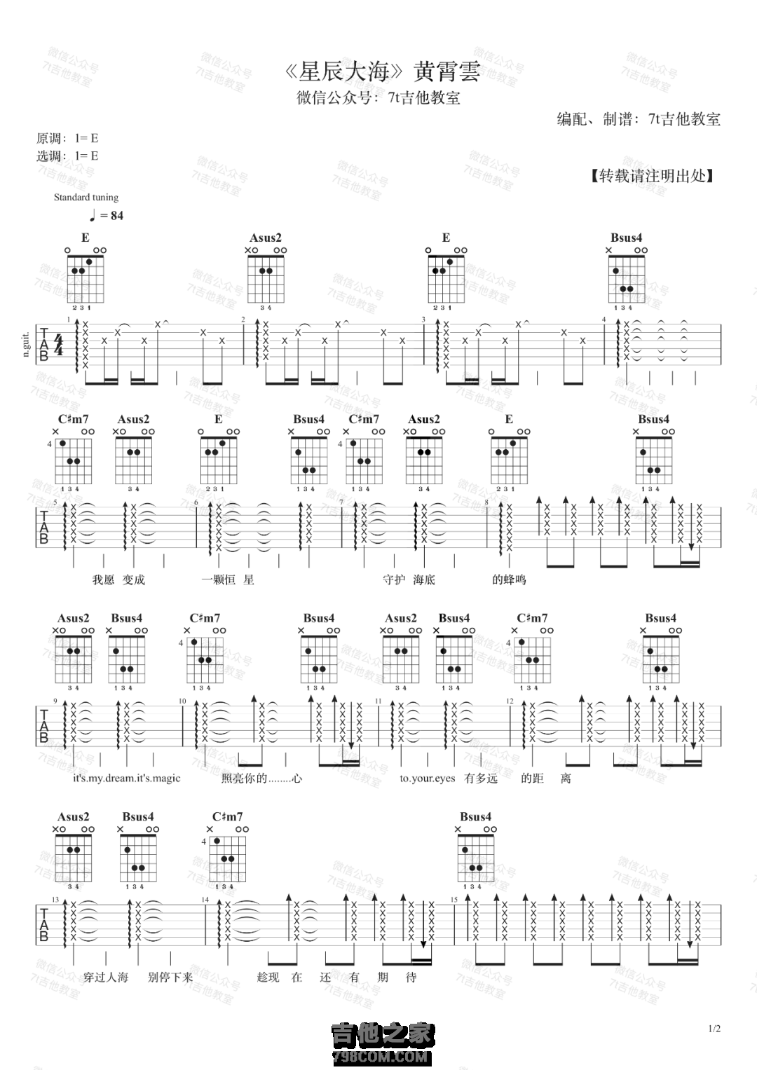 黄霄雲《星辰大海》吉他谱7t吉他教室...