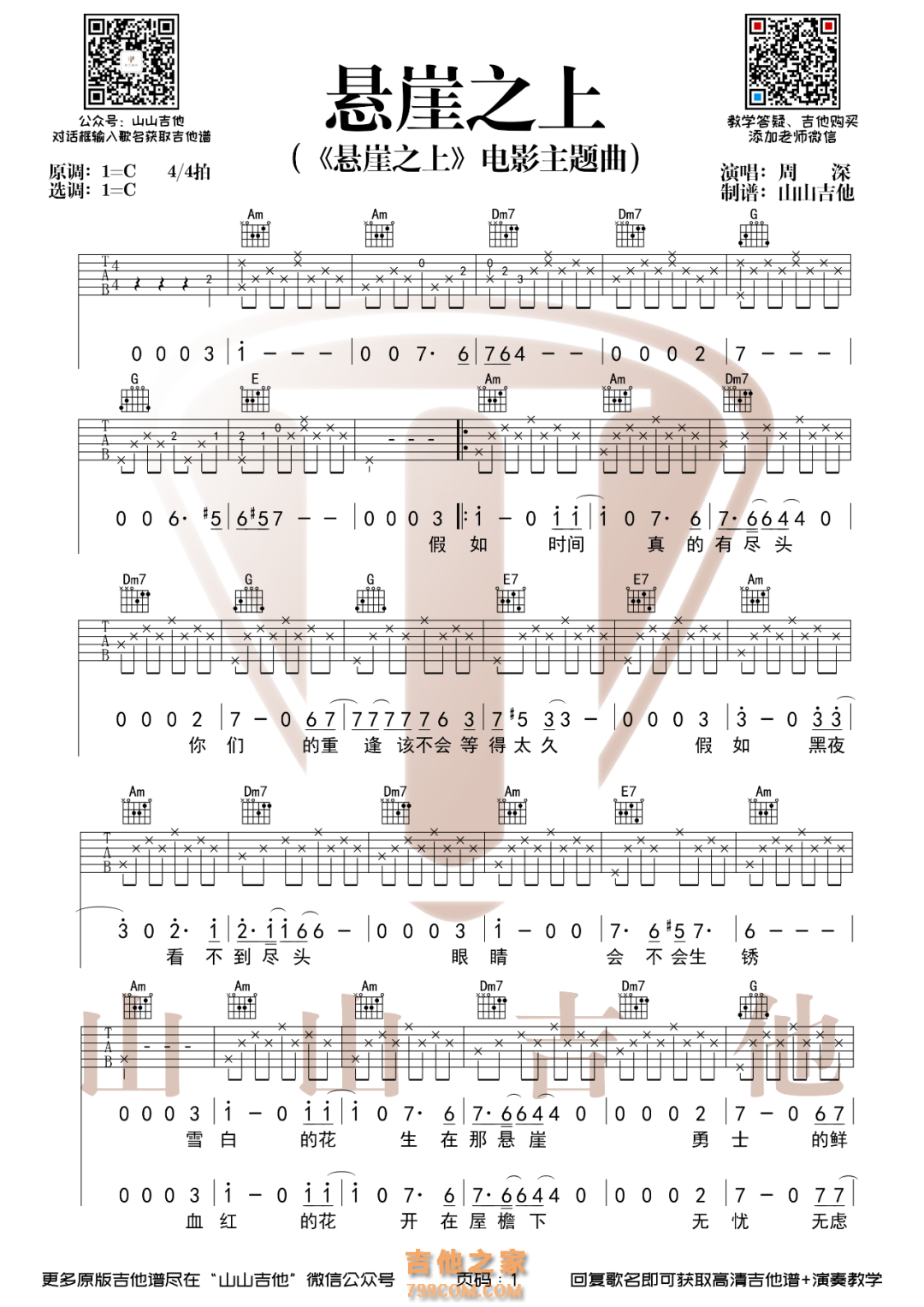 吉他张艺谋电影周深《悬崖之上》吉他谱 山山吉他