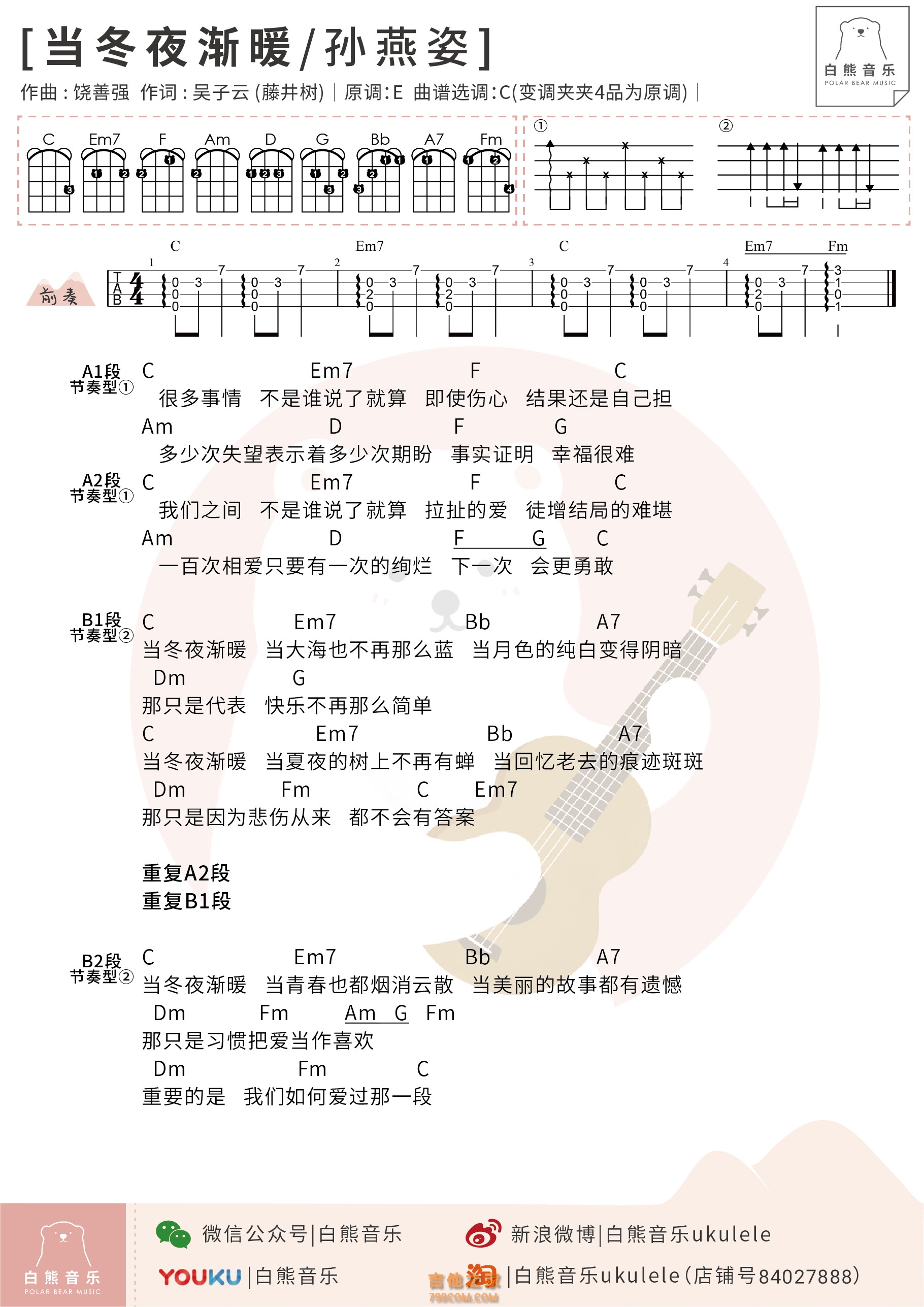 吉他孙燕姿《当冬夜渐暖》尤克里里弹唱谱 白熊音乐