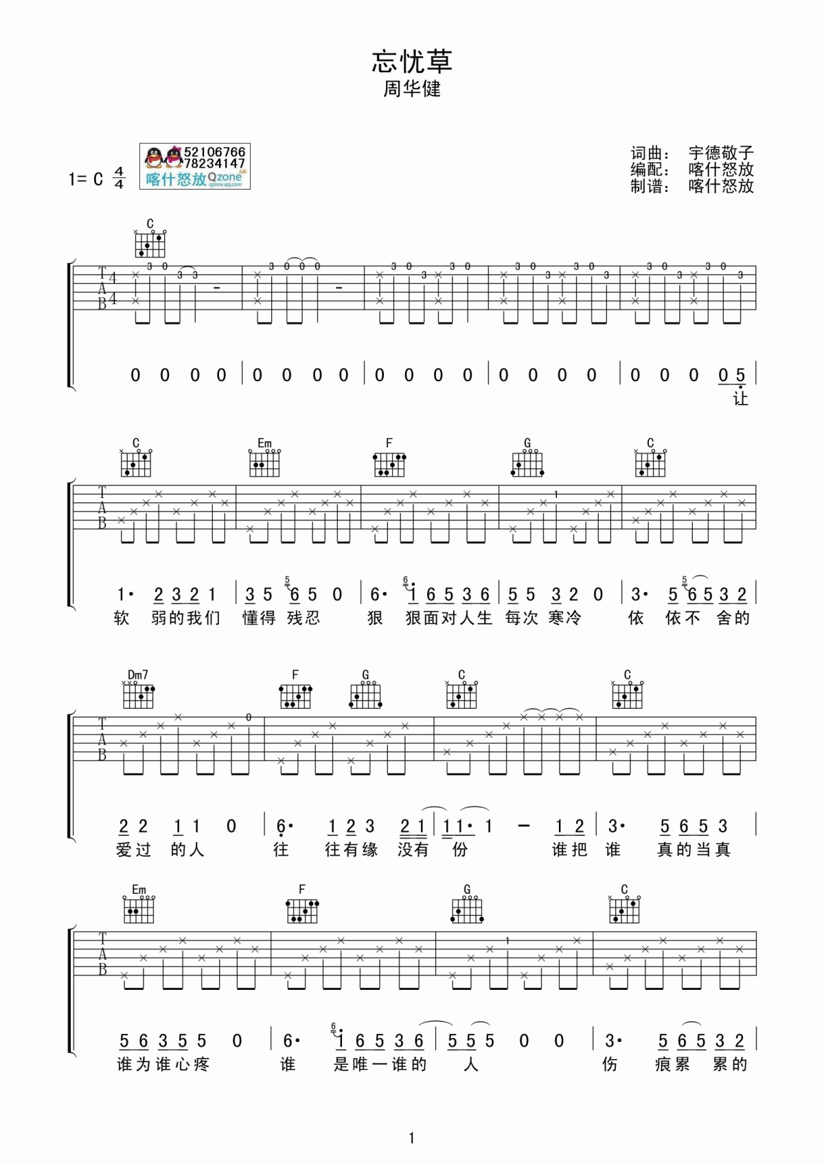 忘忧草吉他谱C调周华健...