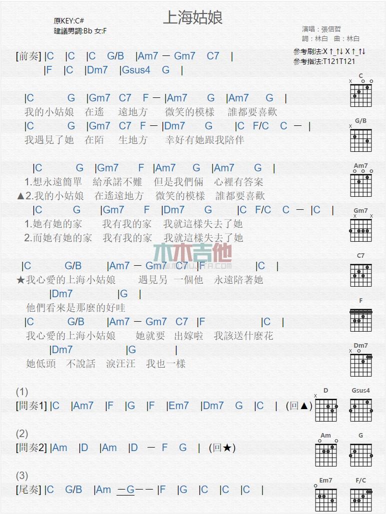 吉他上海姑娘_吉他谱_张信哲