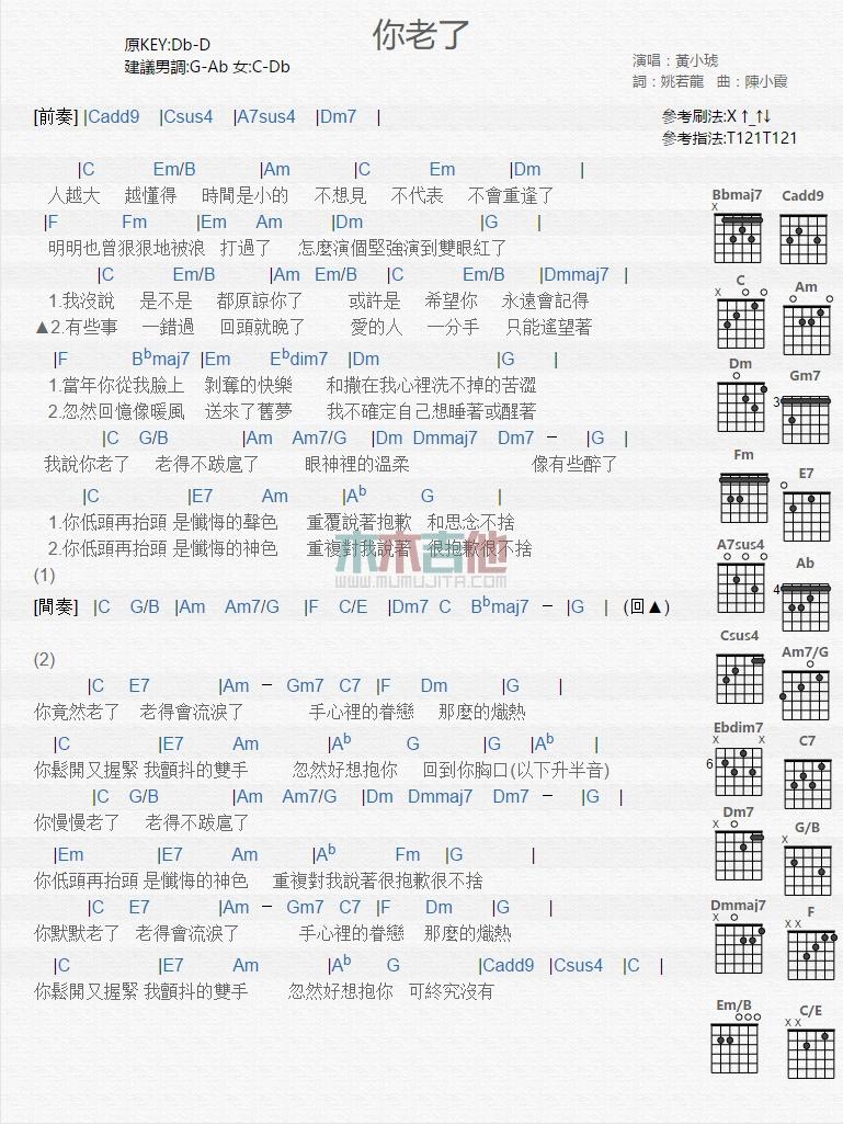《你老了_》吉他谱,采用C调指法编配,共有1张高清图谱,免翻页排版设计。...