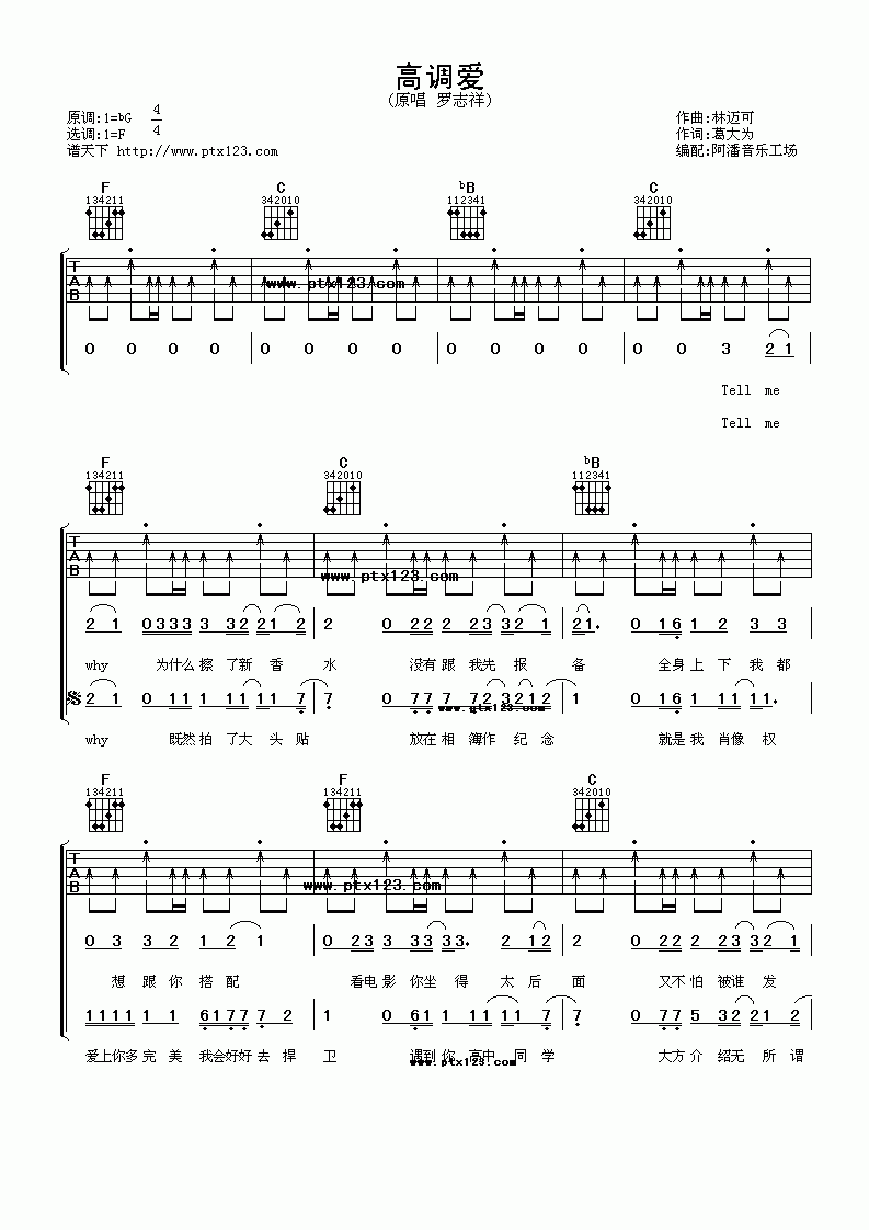 《罗志祥高调爱》吉他谱,采用C调指法编配,共有3张高清图谱。...