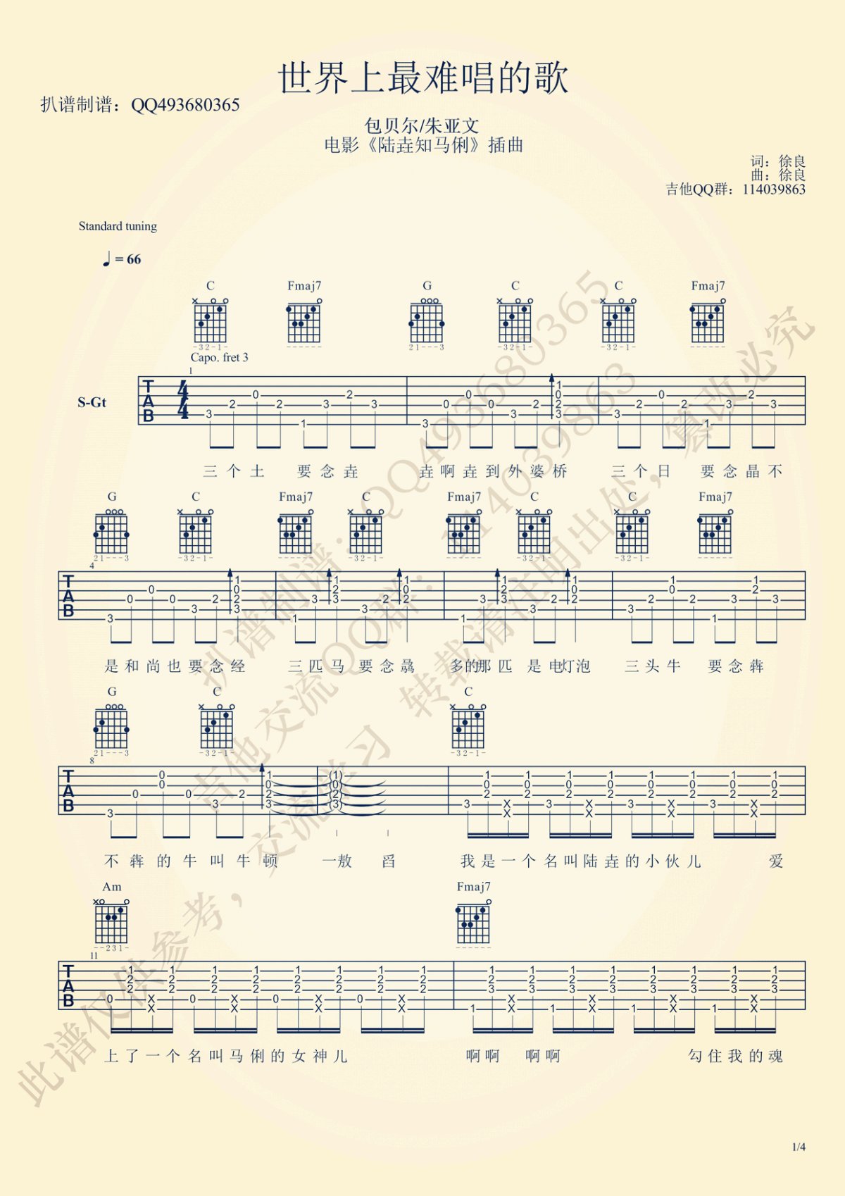 《世界上最难唱的歌》吉他谱,采用C调指法编配,共有4张高清图谱。...