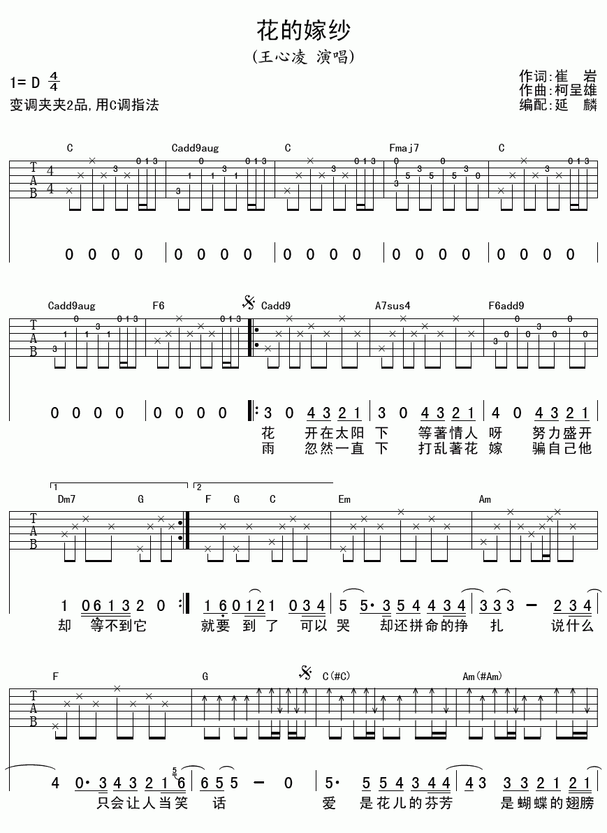 《花的嫁纱》吉他谱,采用C调指法编配,共有2张高清图谱,免翻页排版设计。...