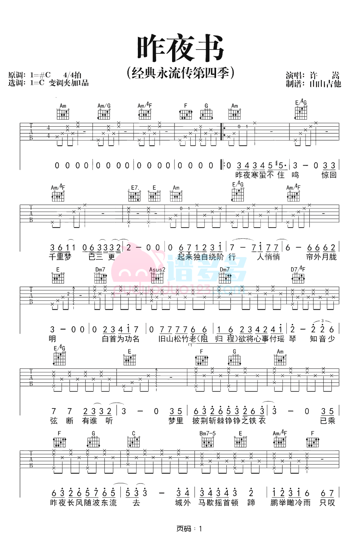 许嵩《昨夜书》吉他谱,采用C调指法编配,共有2张高清图谱,免翻页排版设计。...
