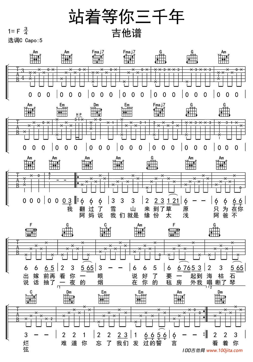 吉他站着等你三千年吉他谱_C调_王琪吉他弹唱谱六线谱