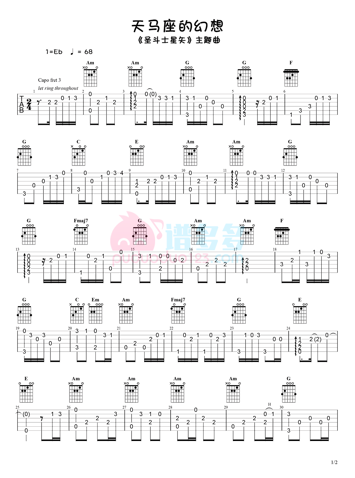 圣斗士星矢主题曲《天马座的幻想》吉他谱,采用C调指法编配,共有2张高清图谱,免翻页排版设计。...