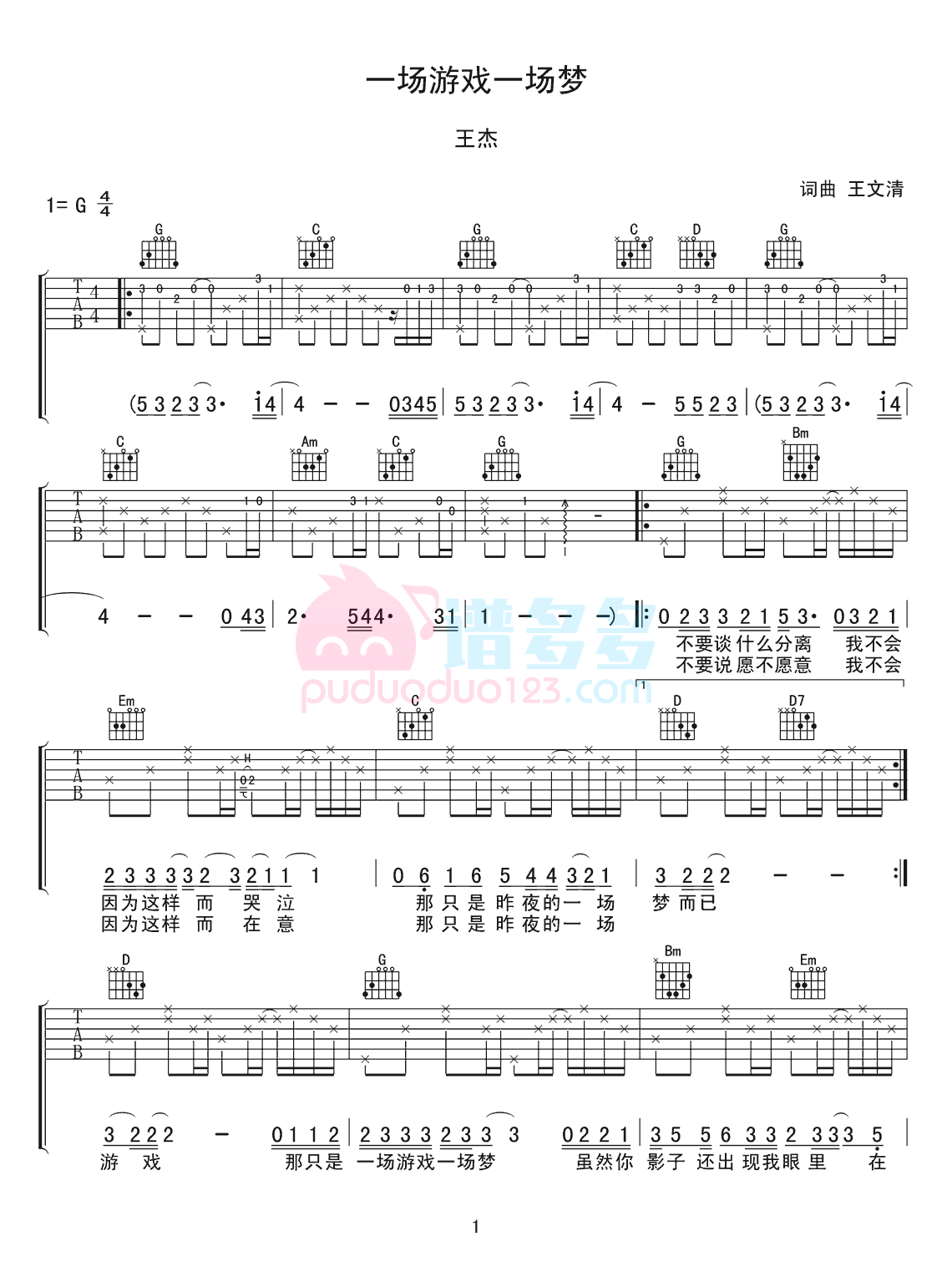 王杰《一场游戏一场梦》吉他谱,采用C调指法编配,共有2张高清图谱,免翻页排版设计。...