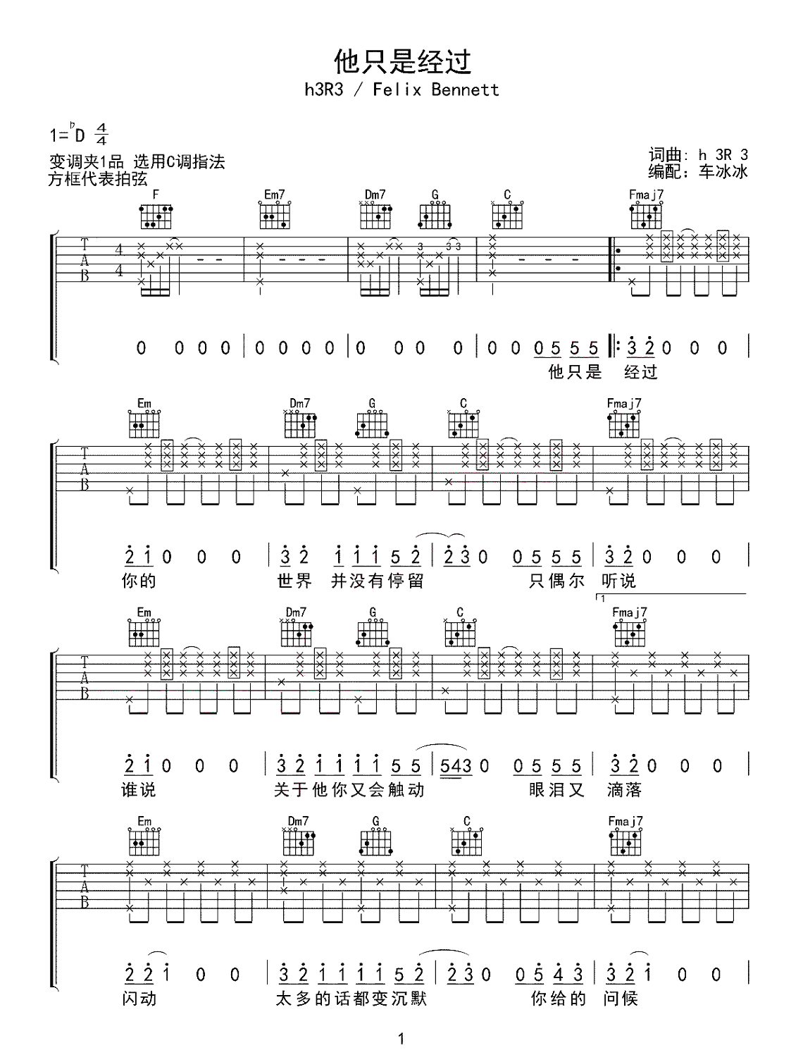 h3R3、高旭《他只是经过》吉他谱,采用C调指法编配,共有4张高清图谱。...