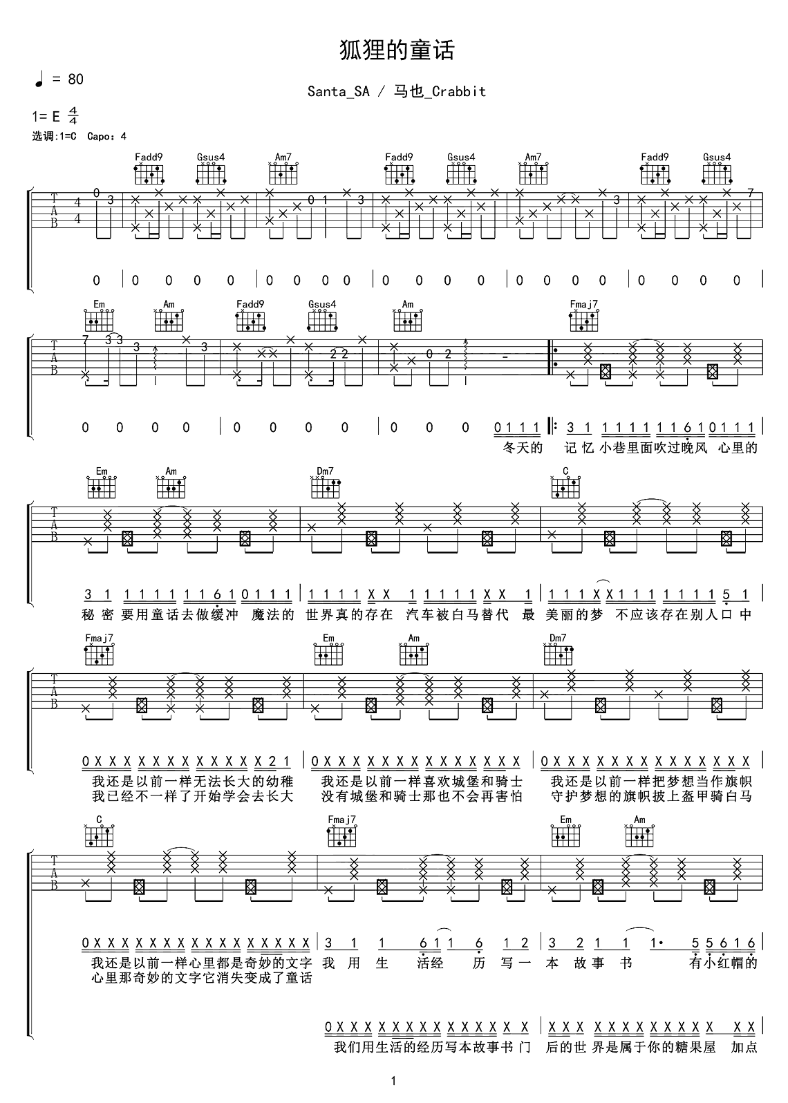 Santa_SA、马也_Crabbit《狐狸的童话》吉他谱,采用C调指法编配,共有2张高清图谱,免翻页排版设计。...