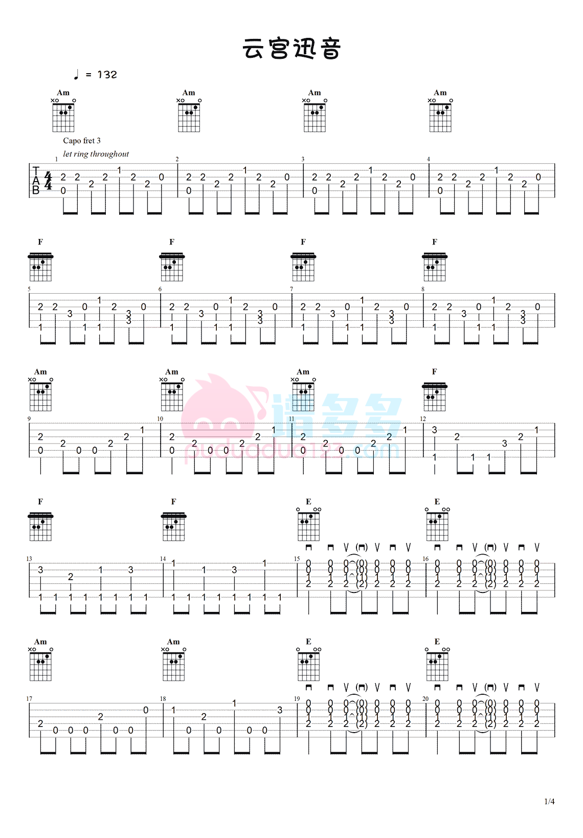 西游记《云宫迅音》吉他谱,采用C调指法编配,共有4张高清图谱。...
