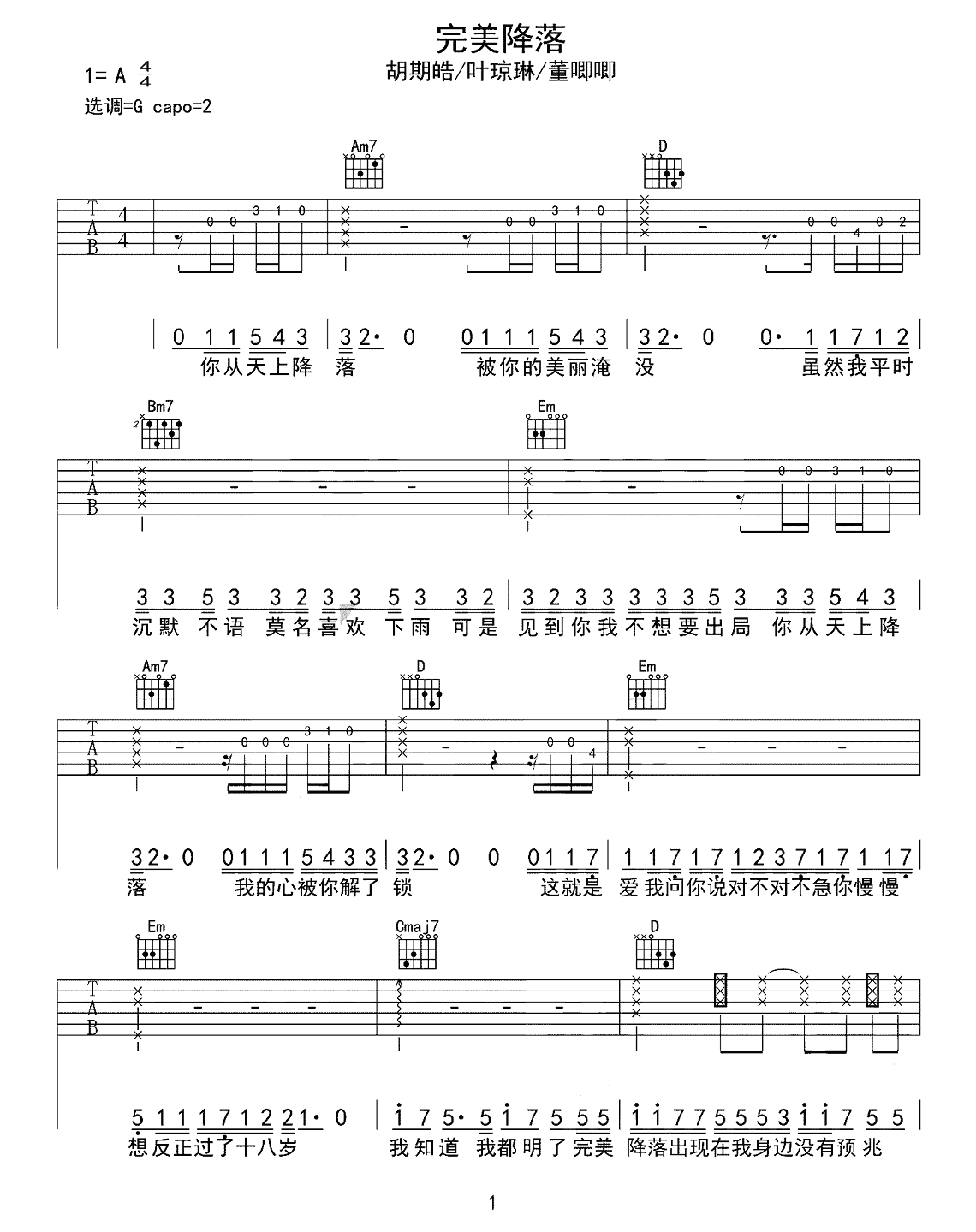 胡期皓、叶琼林、董唧唧《完美降落》吉他谱,采用C调指法编配,共有3张高清图谱。...