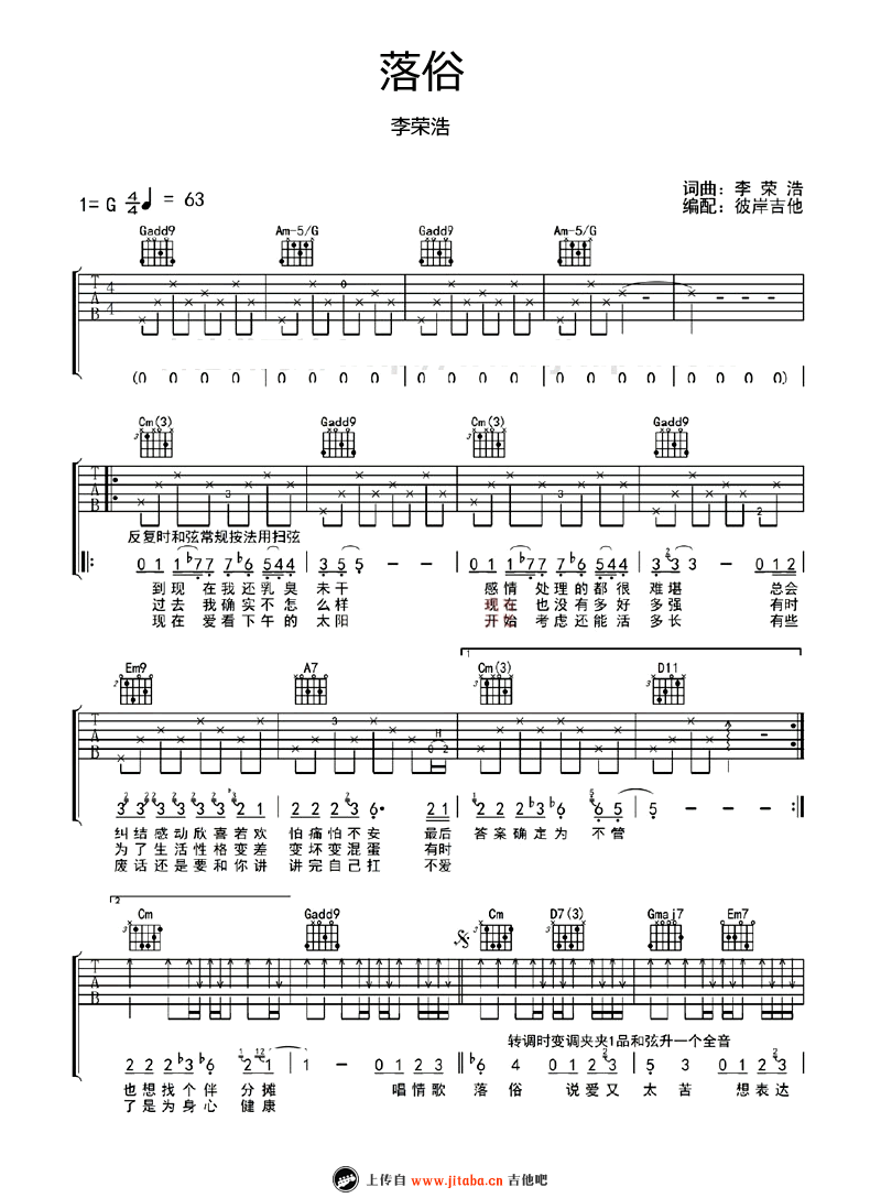 李荣浩《落俗》吉他谱_六线谱弹唱谱_G调...