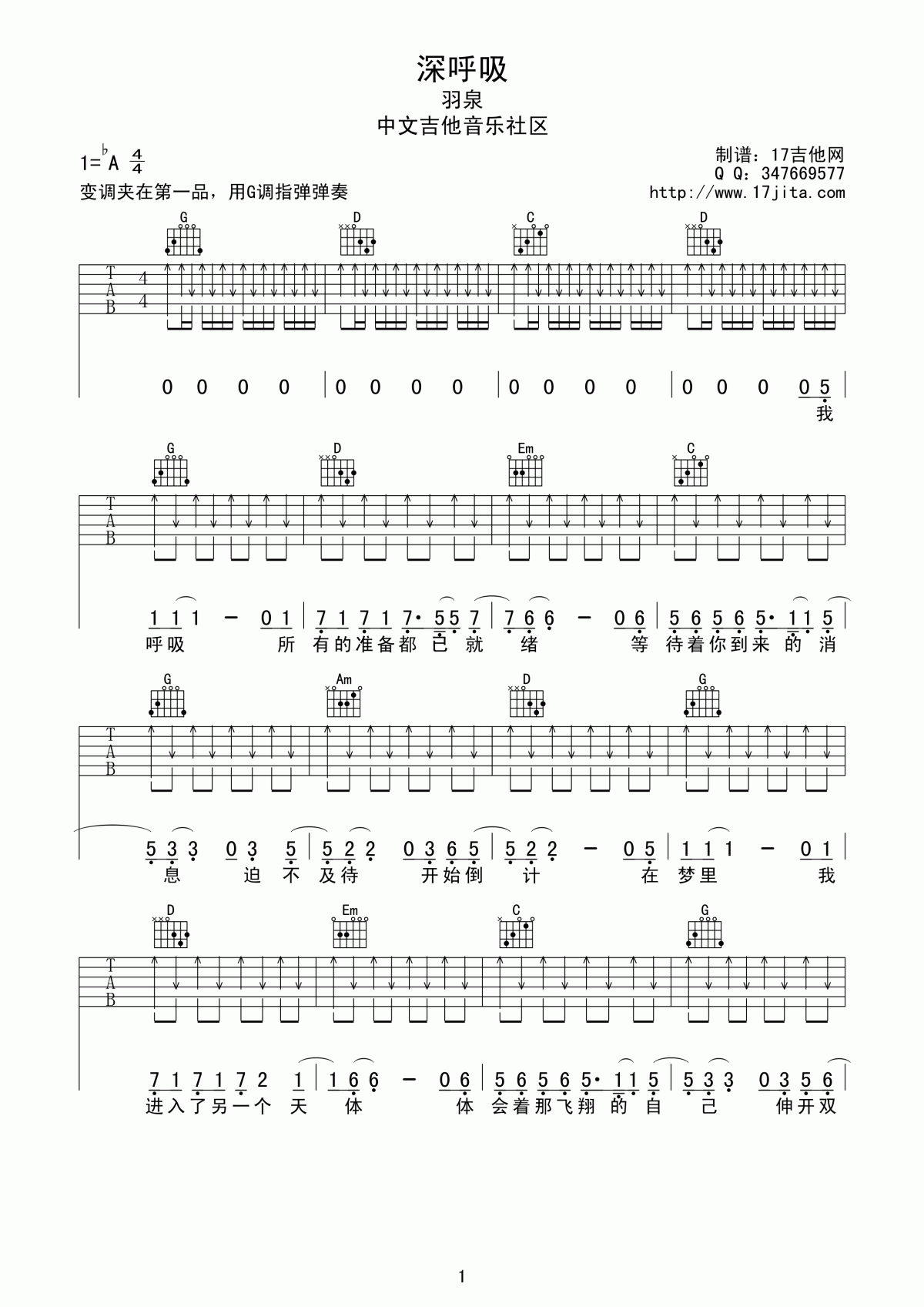 吉他深呼吸吉他谱 G调 扫弦版 羽泉