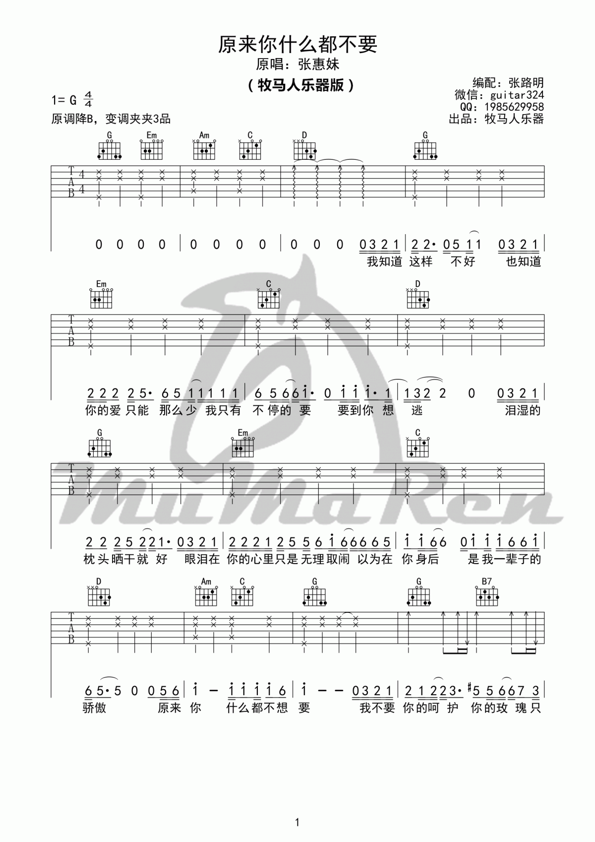 吉他原来你什么都不要_吉他谱_张惠妹
