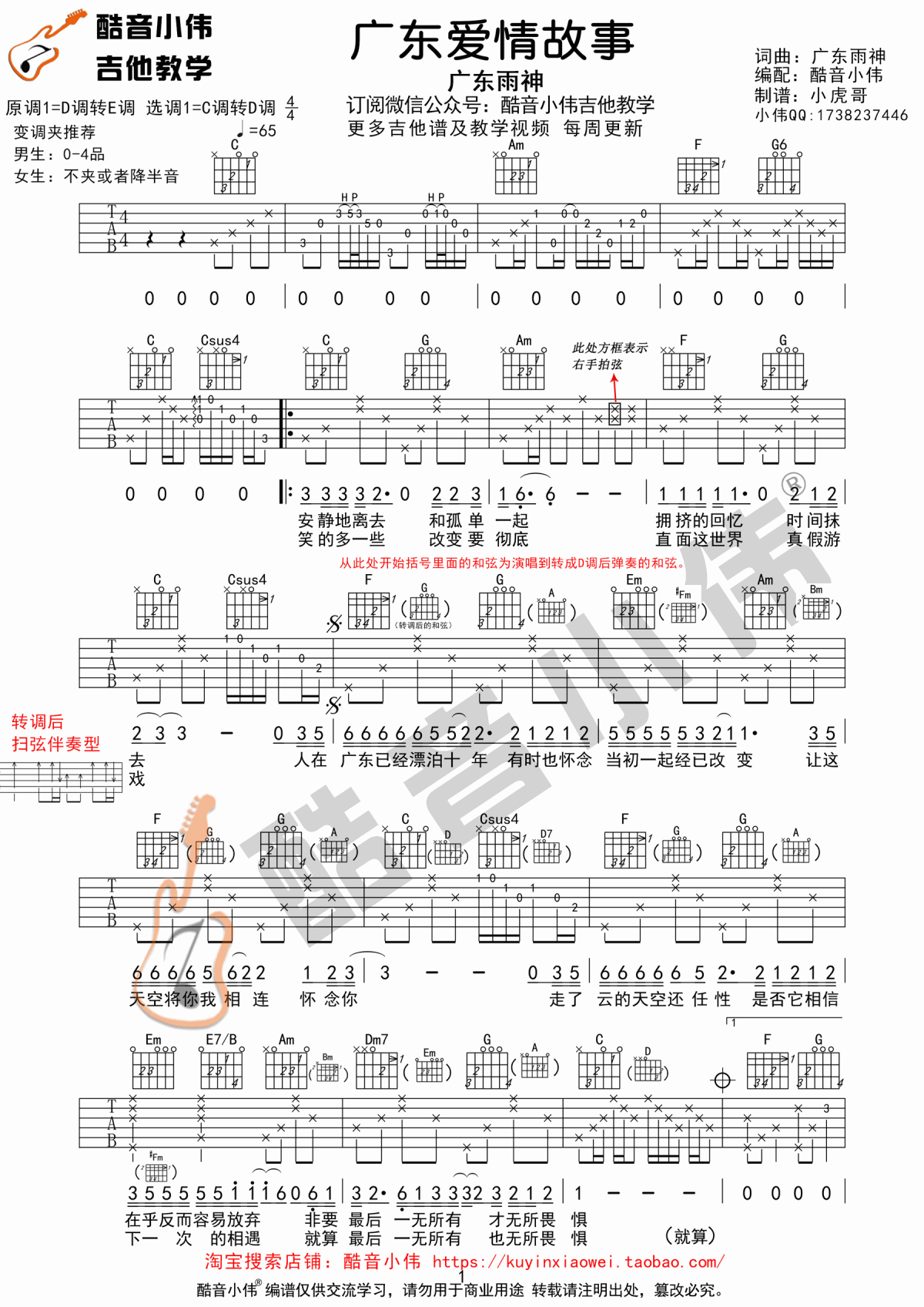 吉他广东爱情故事_C转D调吉他谱_广东雨神