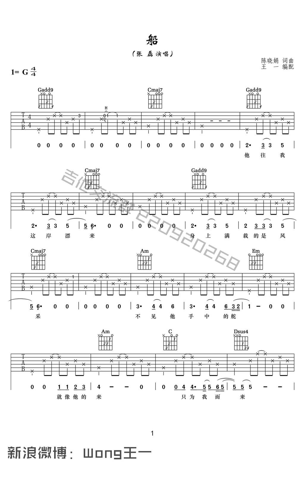 张磊《船》吉他谱,采用C调指法编配,共有2张高清图谱,免翻页排版设计。...