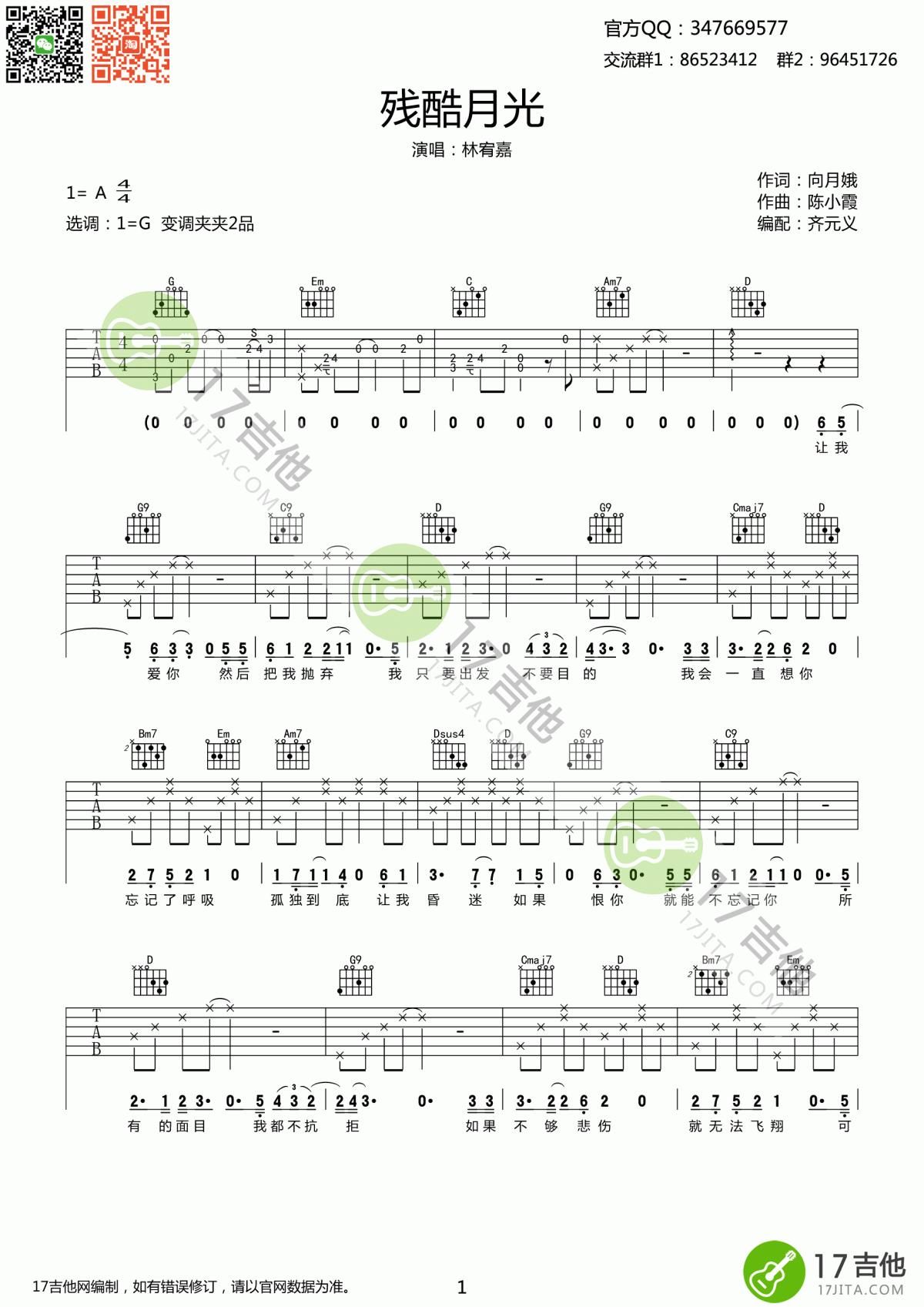 吉他残酷月光图片吉他谱演唱林宥嘉E调高级版