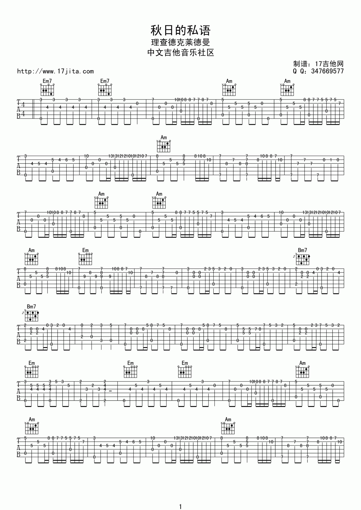 吉他理查德·克莱德曼 秋日的私语吉他谱