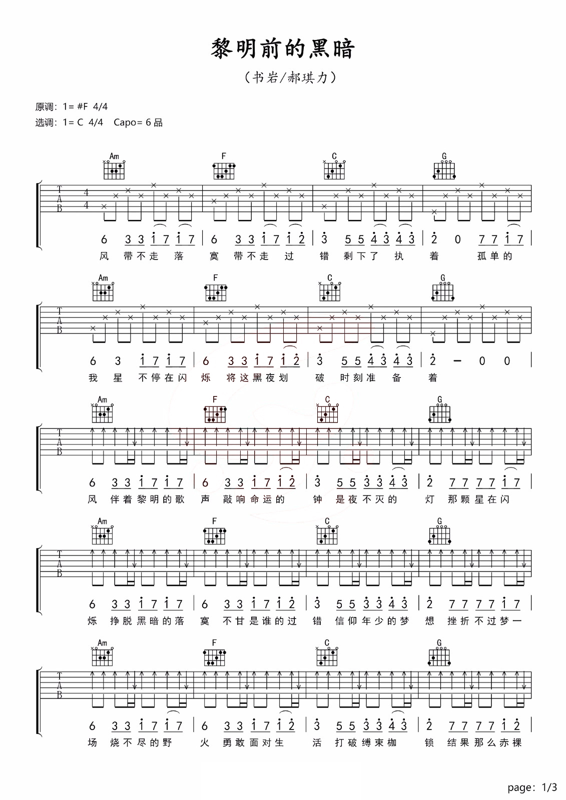 吉他书岩/郝琪力《黎明前的黑暗》吉他谱_吉他弹唱谱_乐事吉他编配