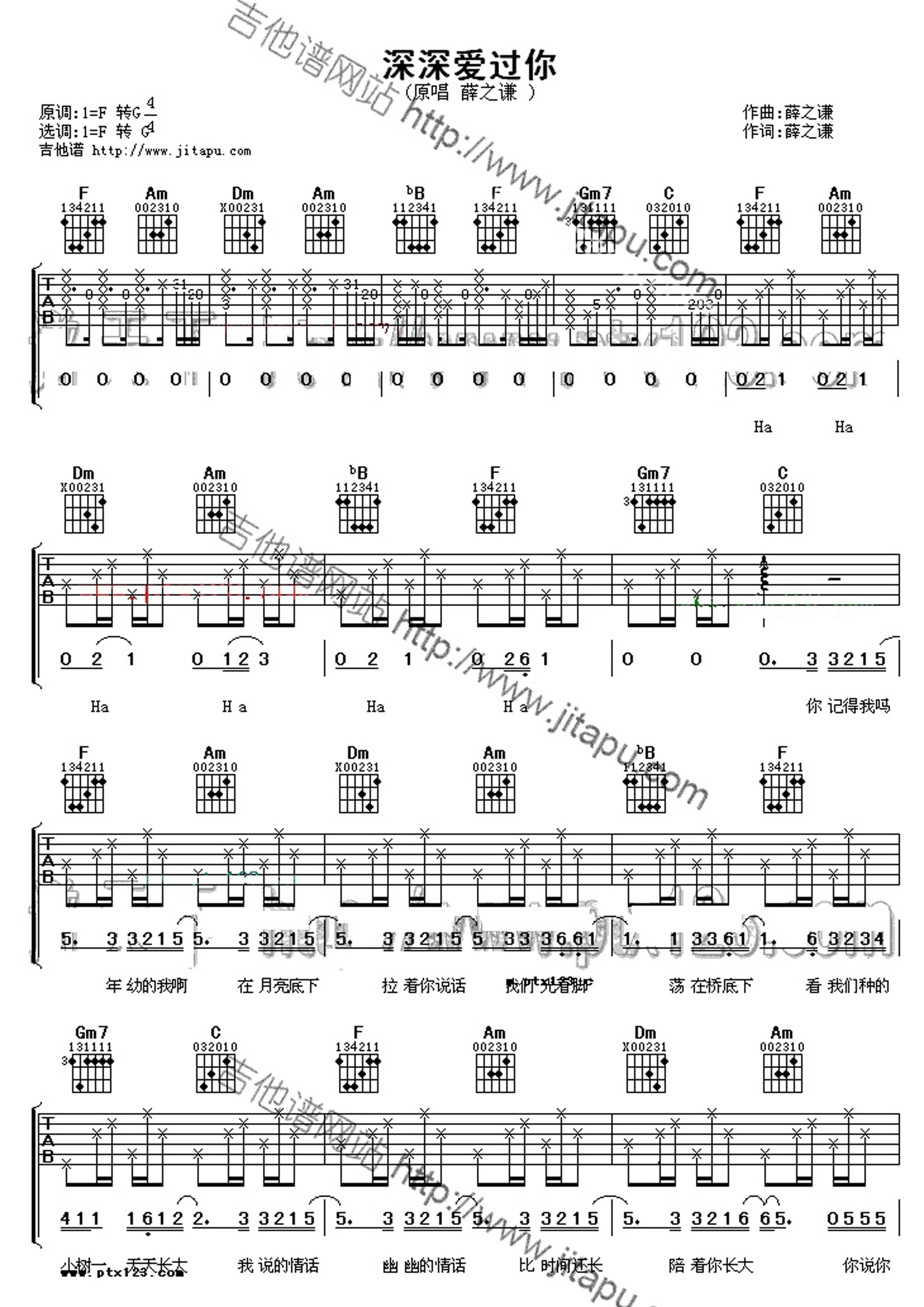 F调原版《深深爱过你》吉他弹唱六线谱...