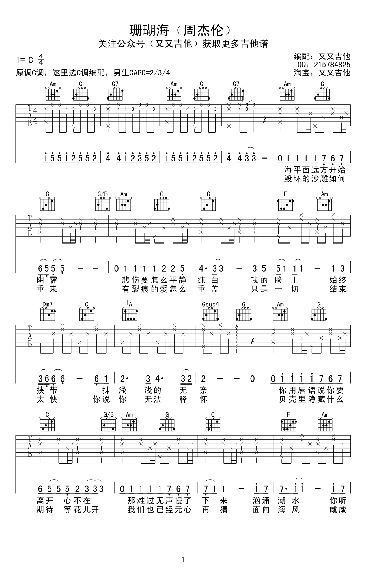 吉他周杰伦《珊瑚海》吉他谱_吉他弹唱谱_又又吉他编配
