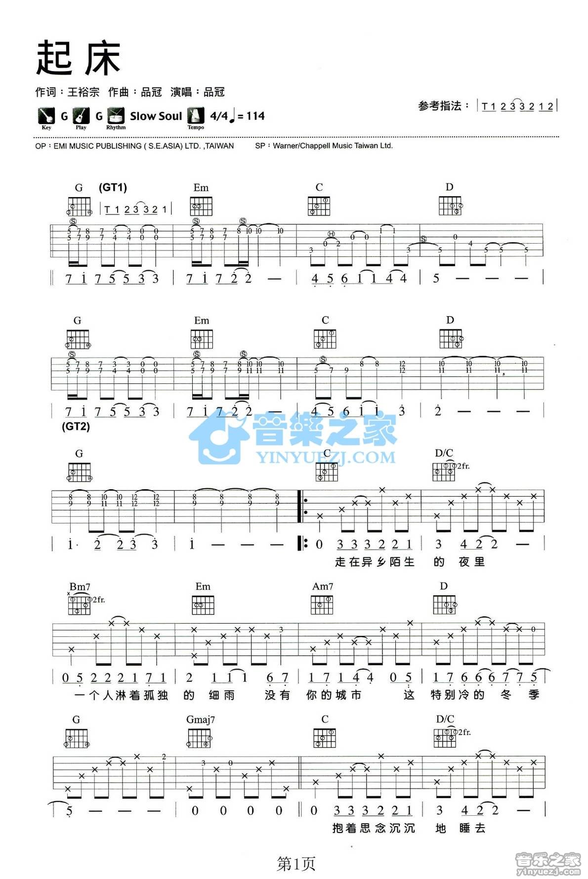吉他品冠《起床》吉他谱_吉他弹唱谱_YYZJ编配