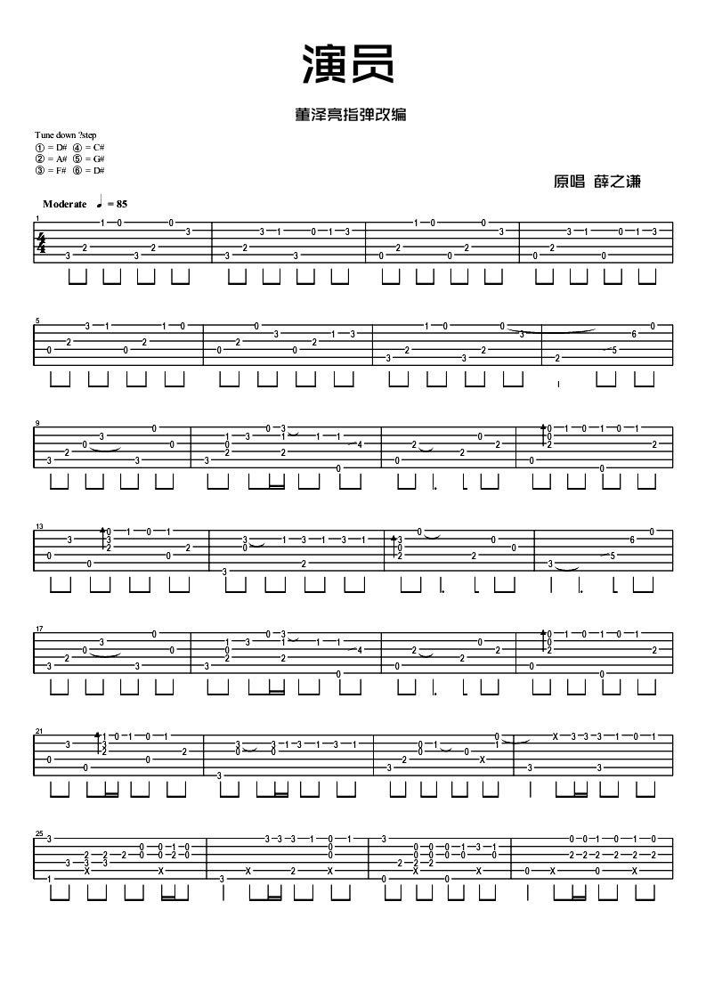 演员吉他独奏谱,PDF转换图片谱格式,薛之谦他是歌手,是段子手,也是演员,这首歌曲旋律感人动听耐人寻味,演员吉他谱指弹版,感谢董泽亮原创改编分享。如果琴友们需要《演员》吉他弹唱谱,也可以在页面下方的相关曲谱里浏览,包括简单版、视频教学版等六线谱例。...