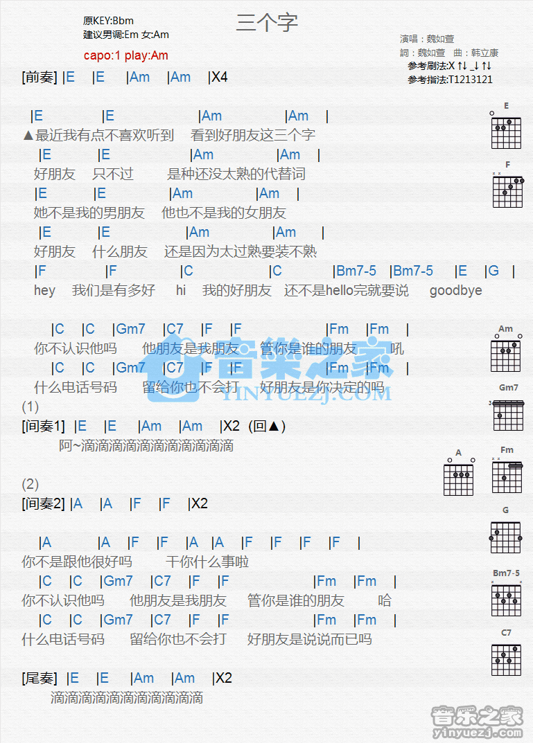 Am调版魏如萱《三个字》吉他和弦弹唱谱...