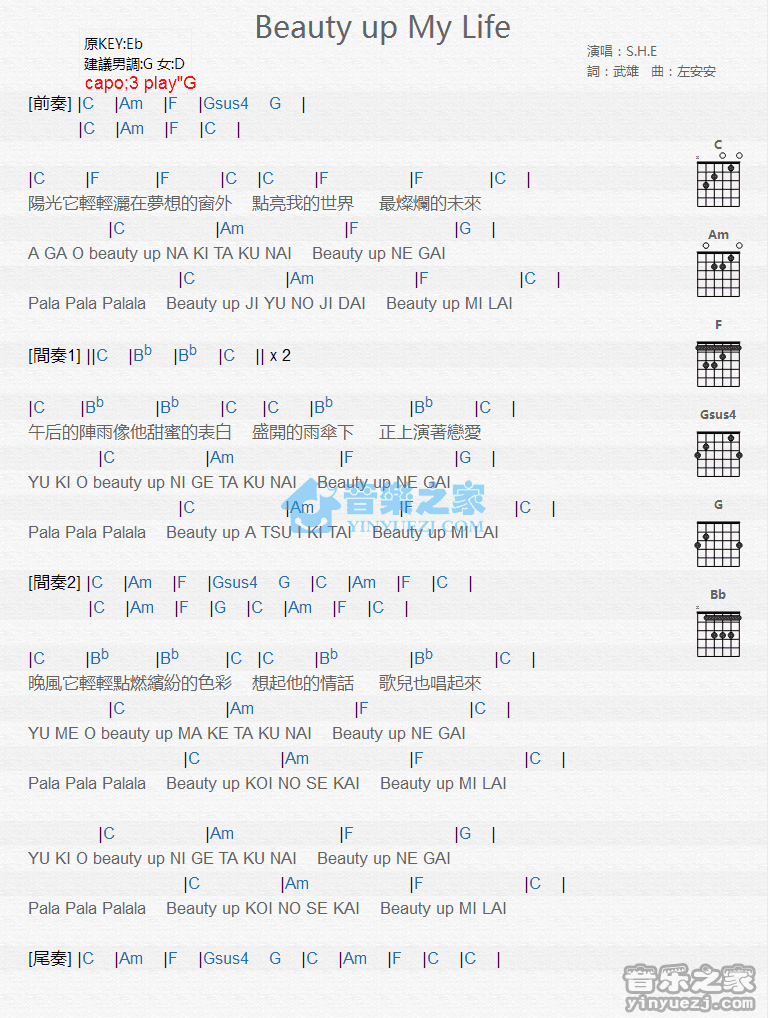 吉他S.H.E《Beauty Up My Life》吉他谱_吉他弹唱谱_YYZJ编配