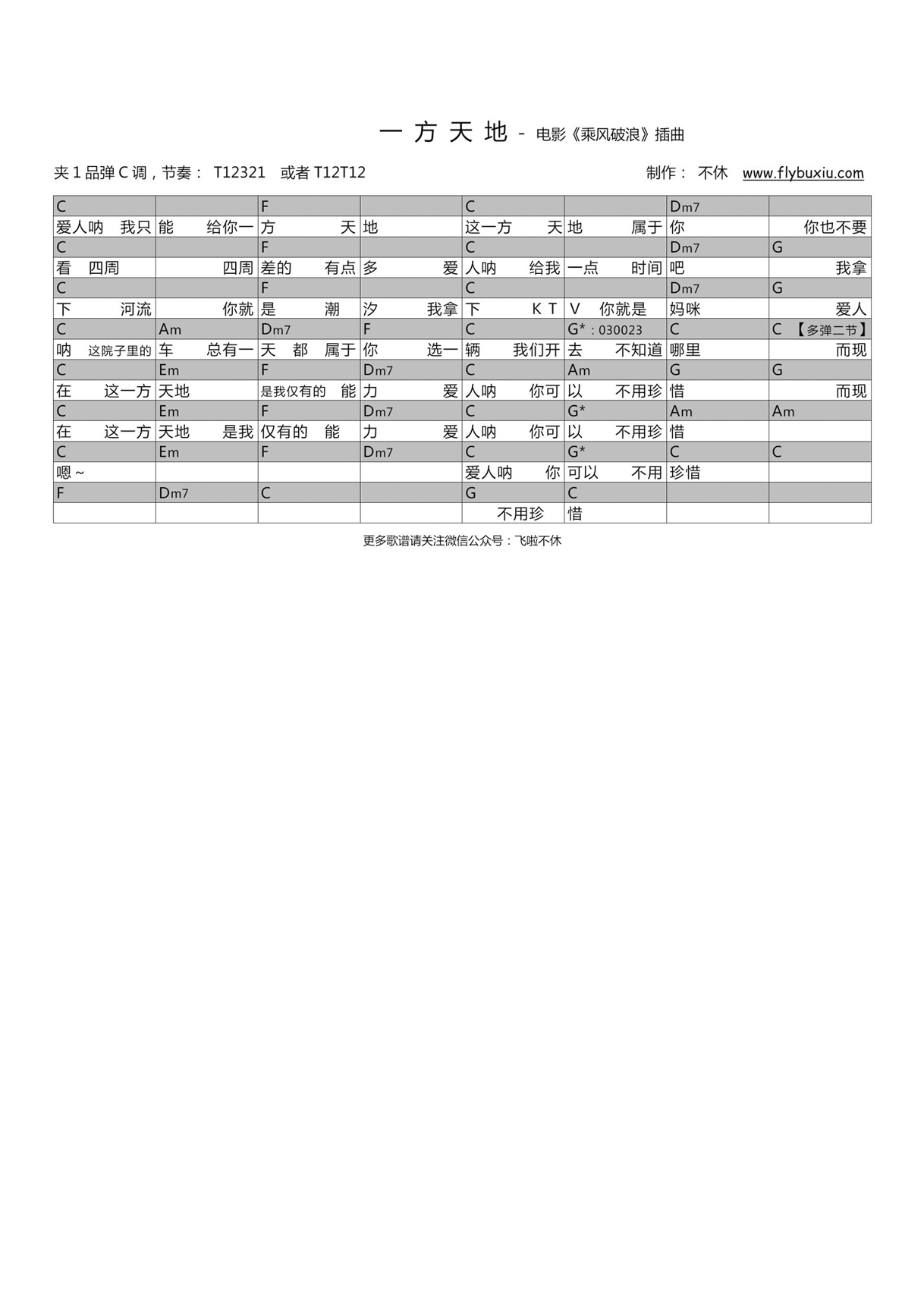 一方天地吉他谱_张本煜_电影《乘风破浪》插曲...