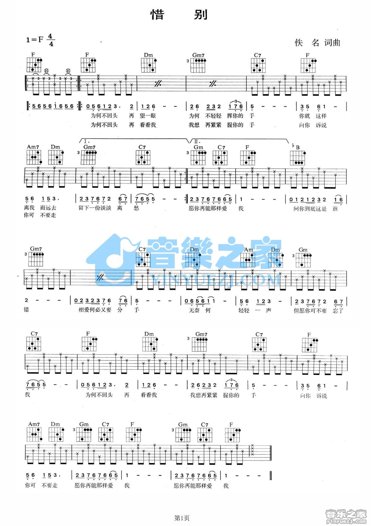 F调版邓丽君《惜别》吉他弹唱六线谱...