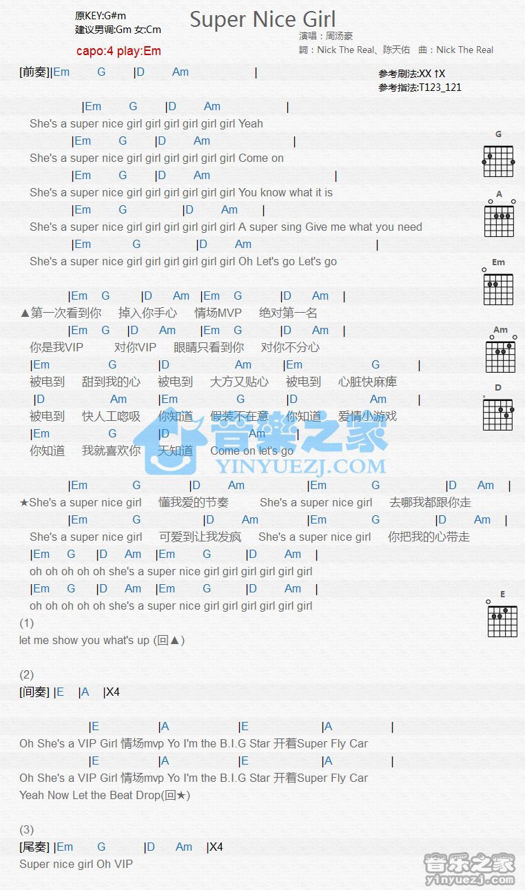 吉他周汤豪《Super Nice Girl》吉他谱_吉他弹唱谱_YYZJ编配