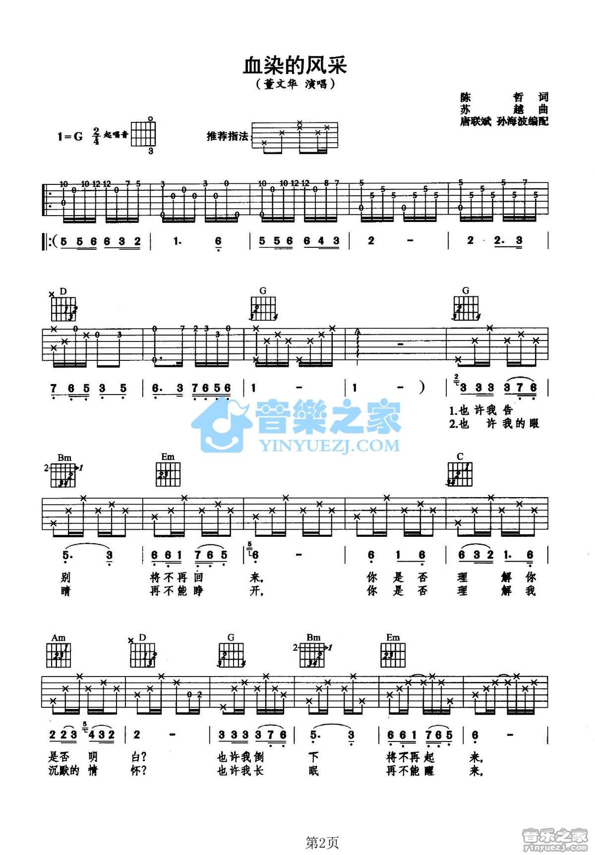 G调版董文华《血染的风采》吉他弹唱六线谱...