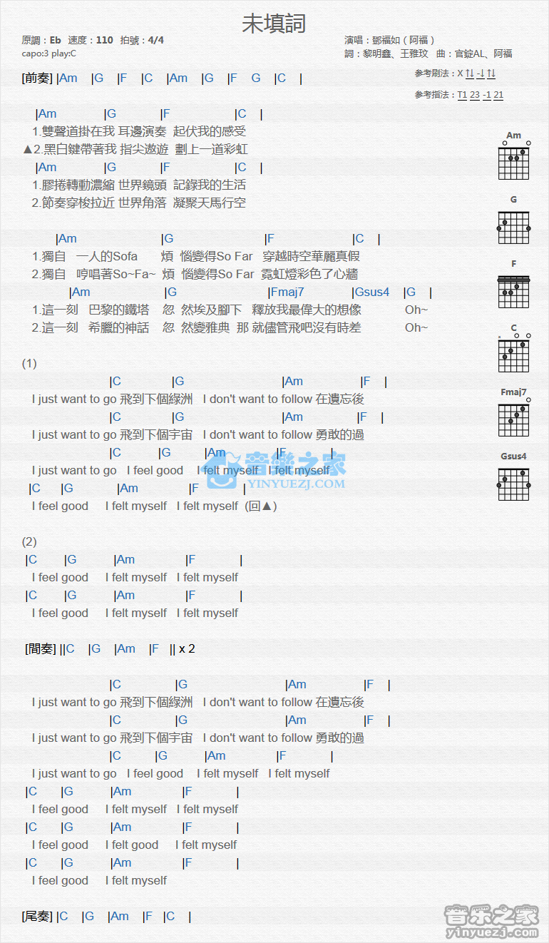 C调版邓福如《未填词》吉他和弦弹唱谱...