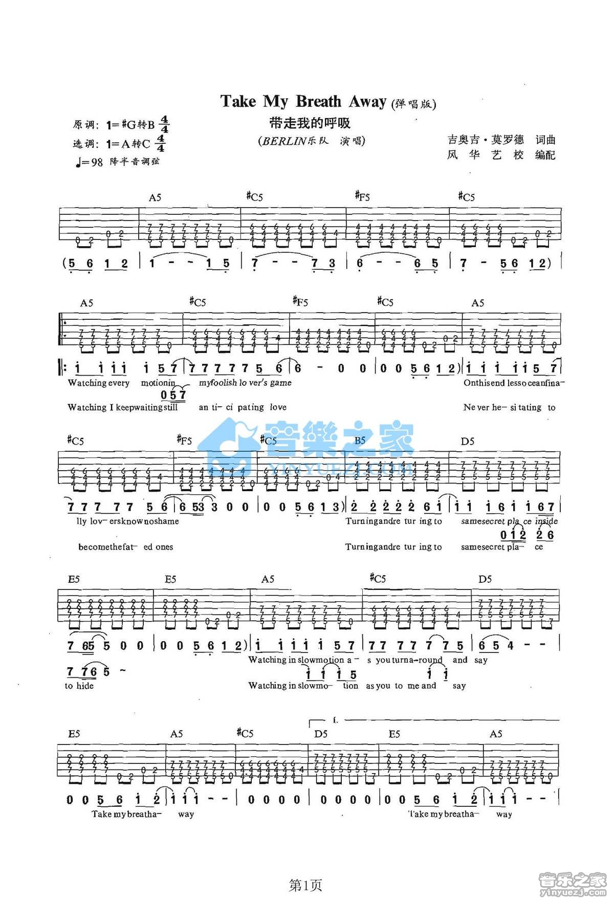 Berlin《TakeMyBreathAway》吉他弹唱六线谱...