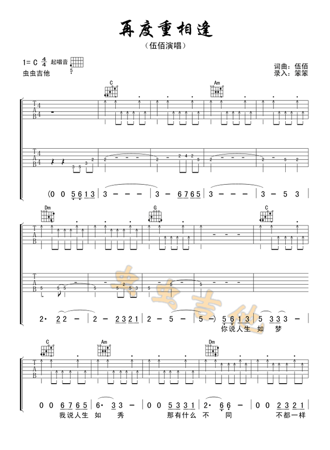 吉他伍佰《再度重相逢》吉他谱_吉他弹唱谱_笨笨编配