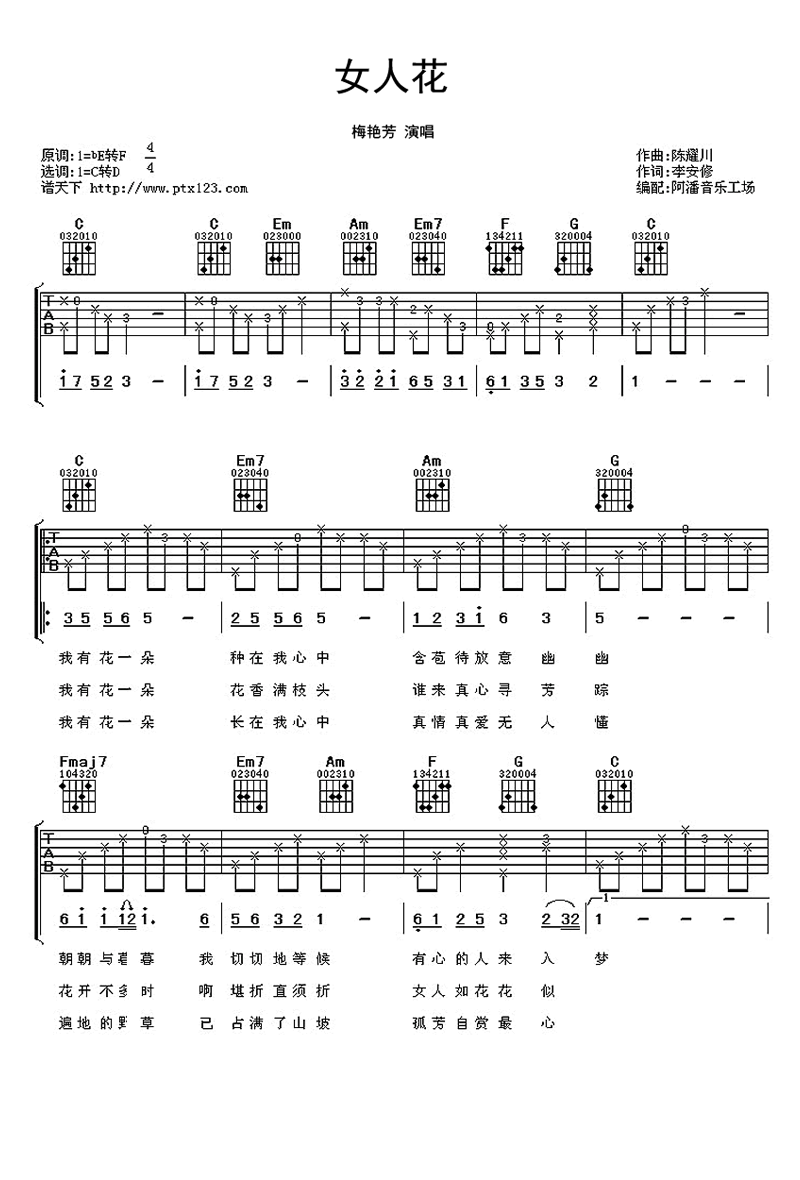 女人花吉他谱,梅艳芳演唱,歌曲选用C转D调。女人花,摇曳在红尘中,女人花,随风轻轻摆动。一首女人花唱出了女人心中孤独,心中的泪。优美的旋律,动心的声音。唯美伤感,听到心碎! ...