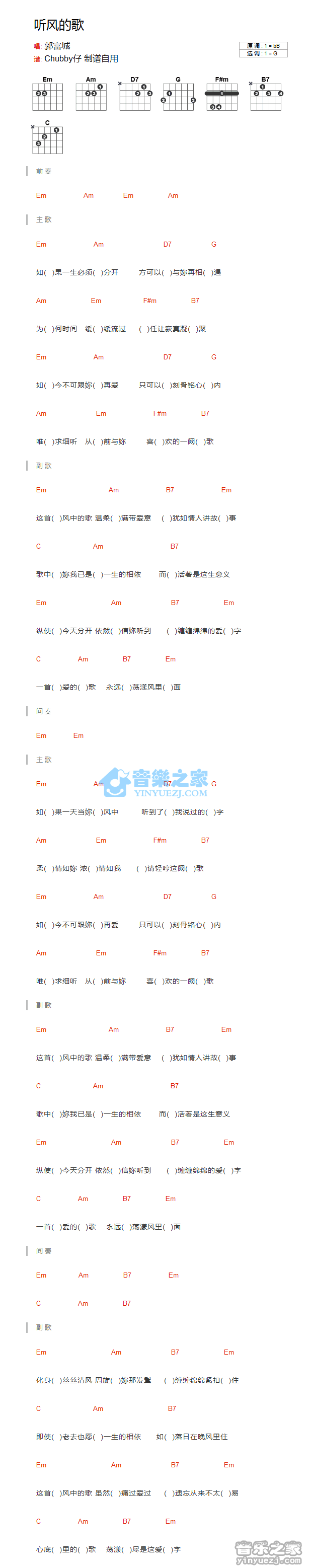 G调版郭富城《听风的歌》吉他和弦弹唱谱...
