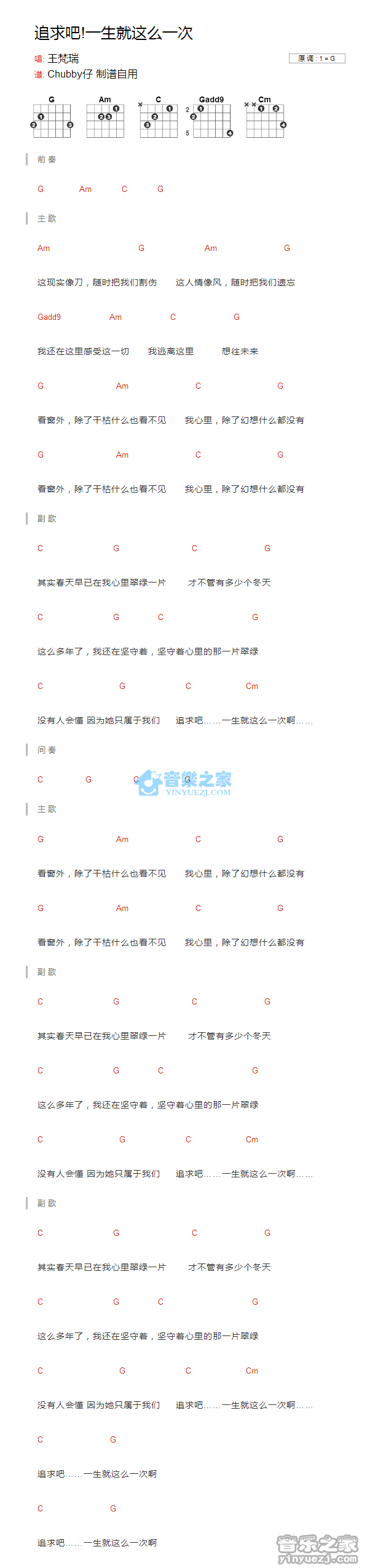 G调版王梵瑞《追求吧一生就这么一次》吉他和弦弹唱谱...